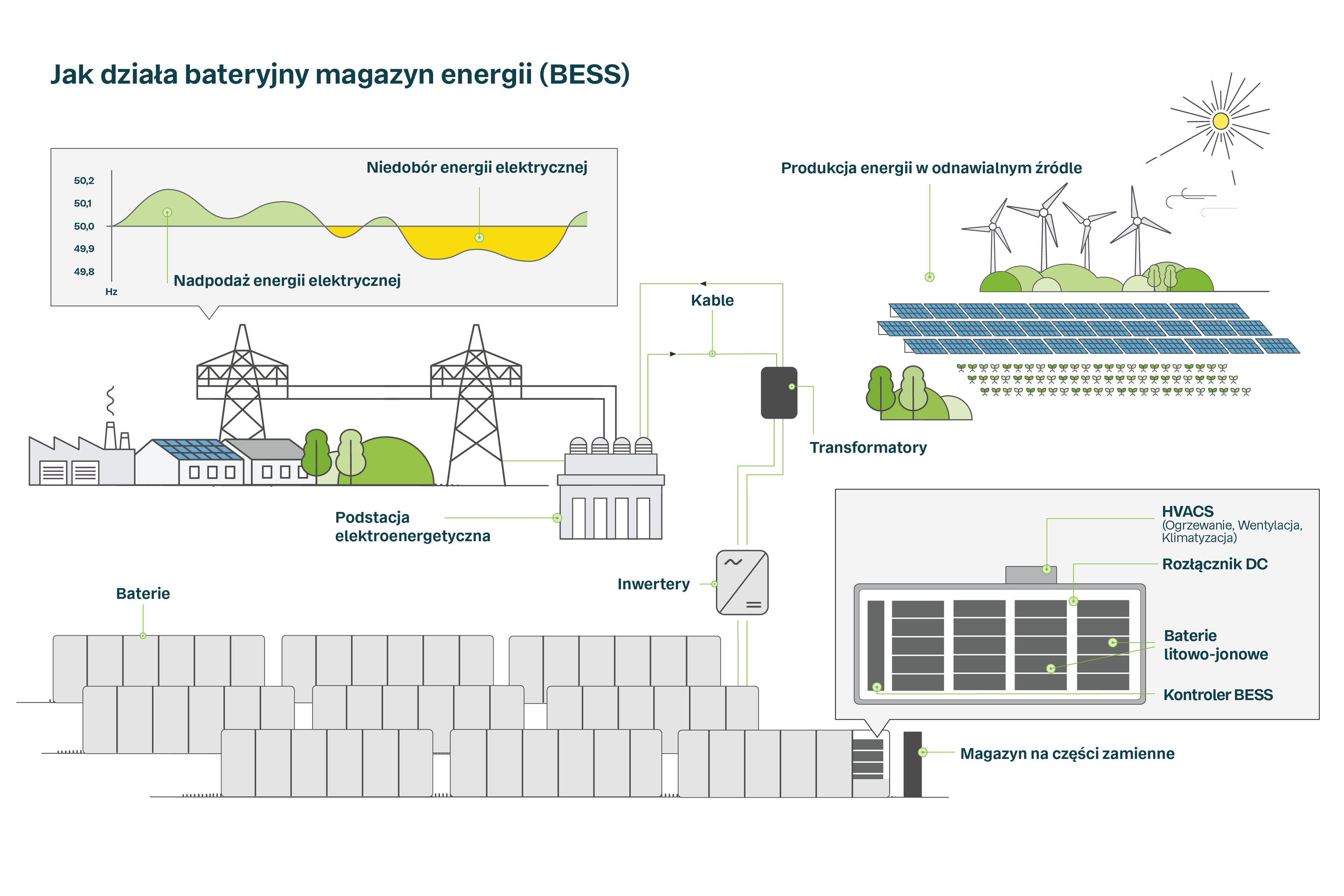 BESS to akumulatory wielokrotnego ładowania, które umożliwiają przechowywanie energii pochodzącej z różnych źródeł, głównie odnawialnych, takich jak energia słoneczna, wiatrowa, a następnie uwalnianie jej, gdy krajowa sieć wymaga zasilania.